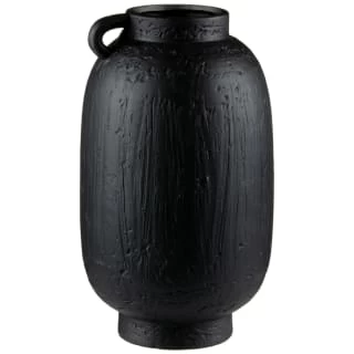A sleek black ceramic vase crafted into a traditional urn shape, with a mini handle and artificial wear marks.